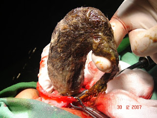 Outros exames se seguiram e foi “diagnosticado” um tumor. E aí, o que fazer agora? Operar, claro. Abriram a coitada pra tirar a porra do tumor e qual foi a surpresa? Sim, uma bola de pêlos, mas não era uma bola de pêlos qualquer. Aquela coisa nojenta tinha 10 kg . De pêlo (a garota carregava o primo Itt da Familia Addams na barriga). Afinal, mas que diabos essa mulher fazia da vida? Será que ela tinha um leão de estimação? Será que ela era a responsável por comer todos os cabelos encontrados em sopas do universo?